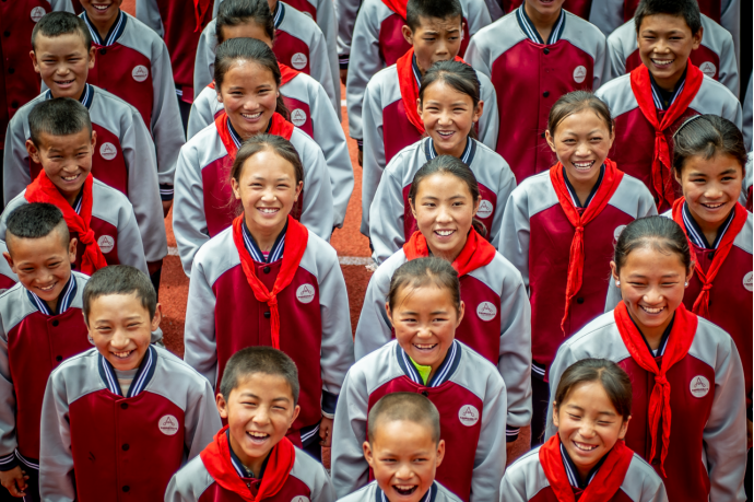 涼山州布拖縣阿布澤魯小學(xué)全體學(xué)生在開學(xué)典禮上穿上了愛心校服