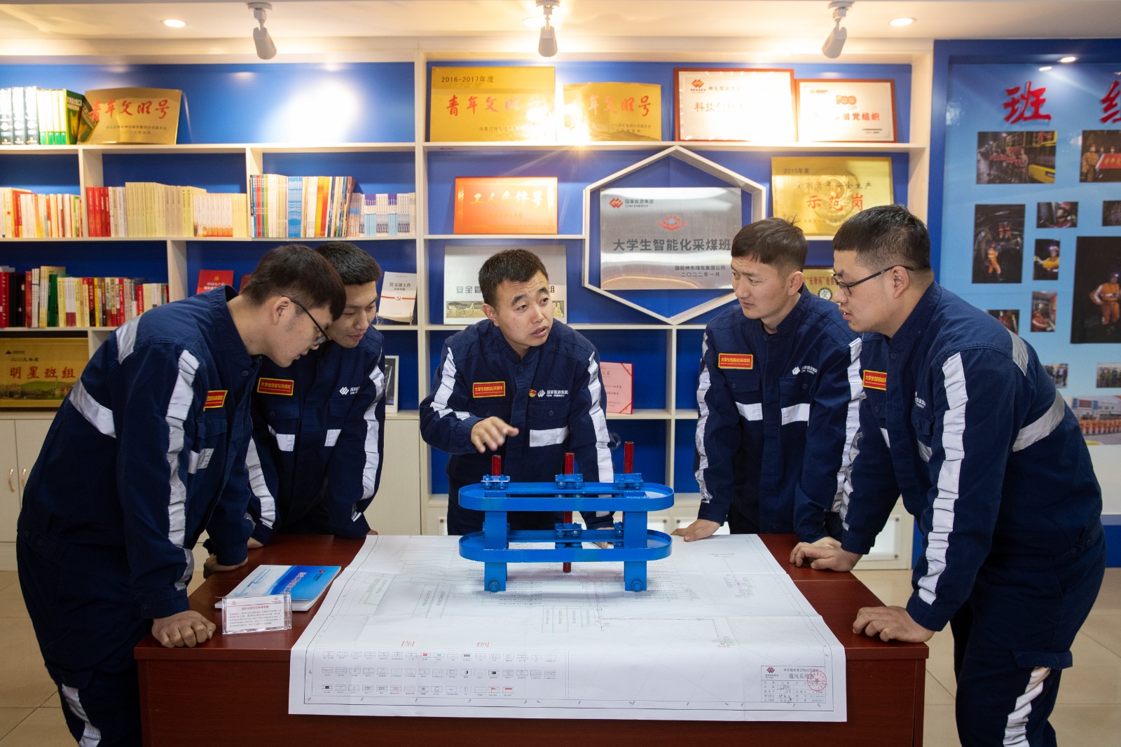 圖為哈拉溝煤礦“大學(xué)生智能化采煤班”創(chuàng)新技改討論