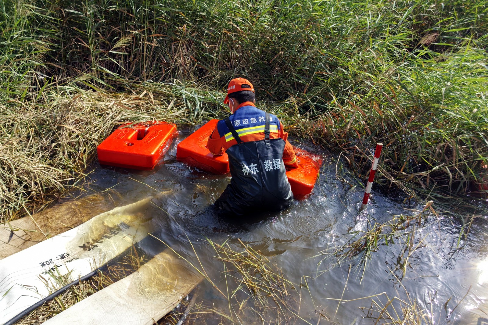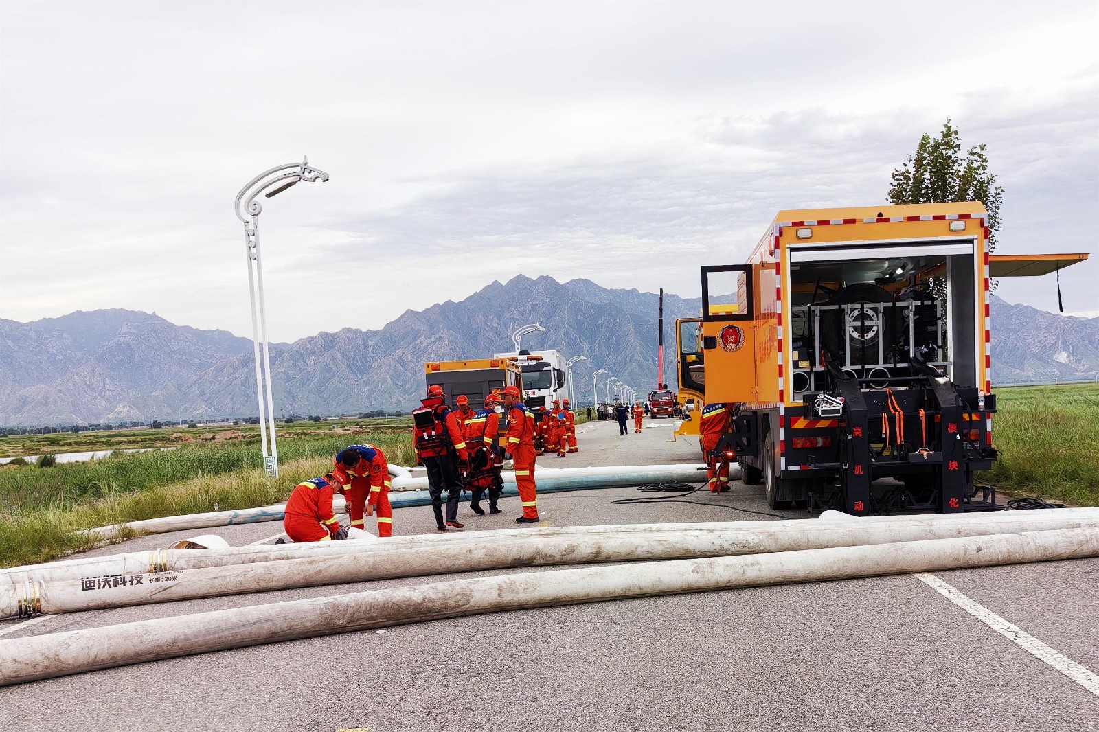 圖為救護隊員到達現(xiàn)場連接排水管路