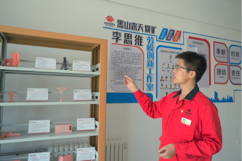 在黑山礦的“李思維勞模創(chuàng)新工作室”里,擺放著兩排展架,陳列著這些年創(chuàng)新工作室成員獲得的每一個(gè)創(chuàng)新成果,還用3D打印機(jī)制作了微縮版的模型,標(biāo)明背景、內(nèi)容、實(shí)施方案和效益預(yù)測(cè),一目了然。