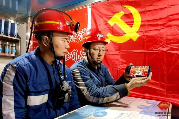圖為國(guó)神公司上榆泉煤礦采煤隊(duì)職工在該礦井下餐車處收看慶祝中國(guó)共產(chǎn)黨成立100周年大會(huì)盛況