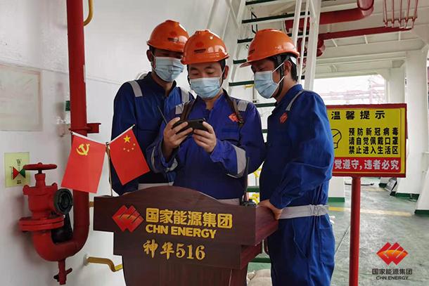 航運公司神華518輪船員在張家港沙洲電廠碼頭靠泊收看慶祝中國共產(chǎn)黨成立100周年大會盛況