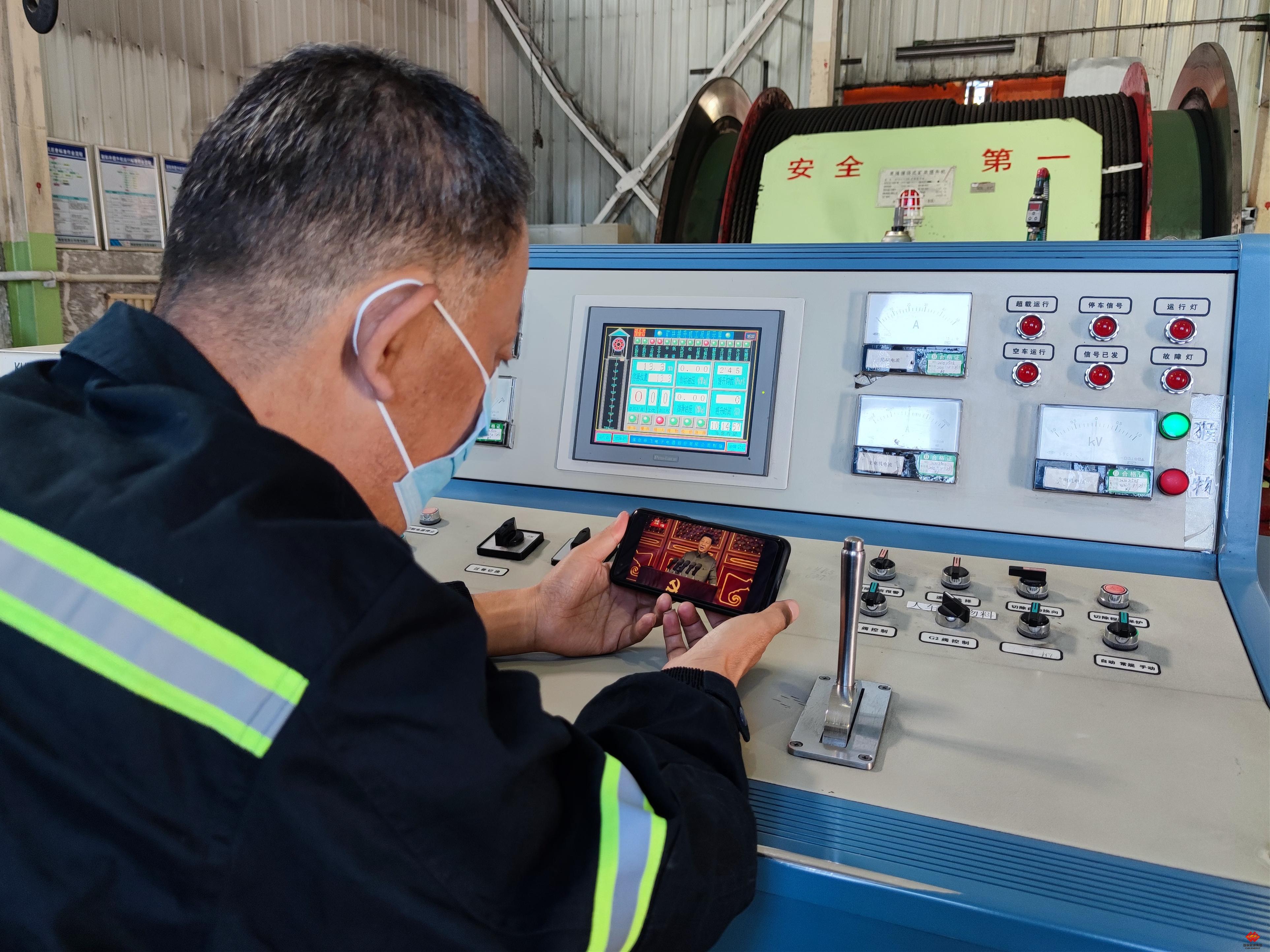圖為新疆公司寬溝煤礦黨員職工在絞車房收看慶祝中國(guó)共產(chǎn)黨成立100周年大會(huì)