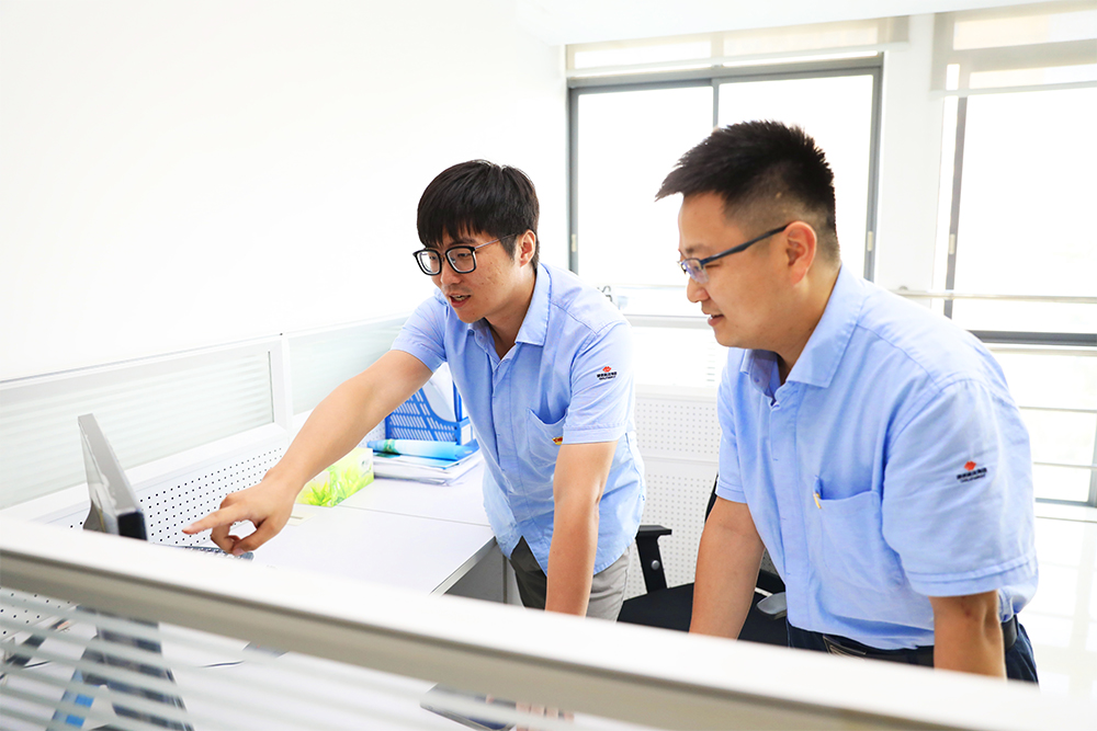 圖為廣西國能能源發(fā)展有限公司規(guī)劃建設部主管熊浩、廣西國能能源發(fā)展有限公司貴港分公司副經理宋晨光在風電場智慧監(jiān)控平臺上查看風機運行數(shù)據(jù)。