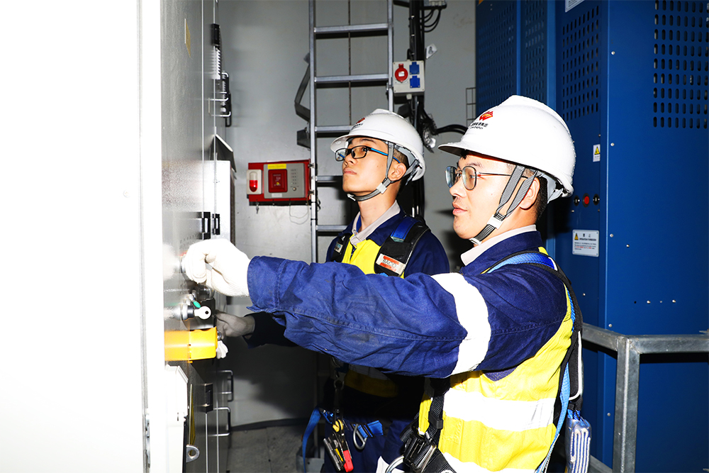 圖為天堂頂風電場運維人員潘展?jié)h、劉振強正在風機內部進行設備維護。