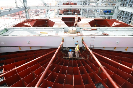 圖為工作人員正在對空氣預(yù)熱器換熱元件進行安裝工作
