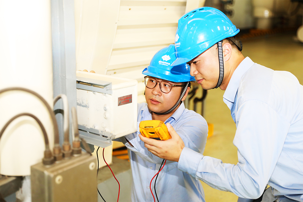 圖為寶慶電廠發(fā)電運(yùn)行部巡檢員顏慶江、劉棵正在車間里調(diào)節(jié)氫側(cè)密封油壓差